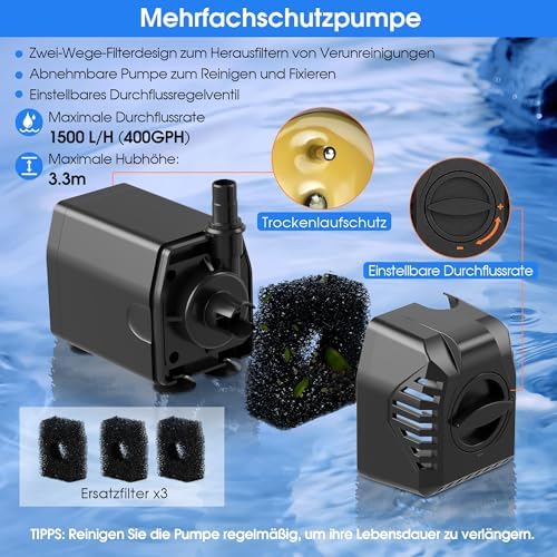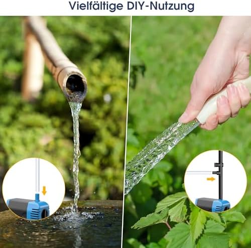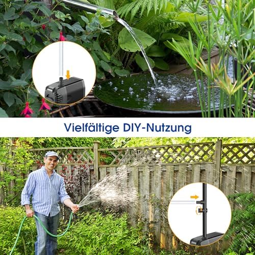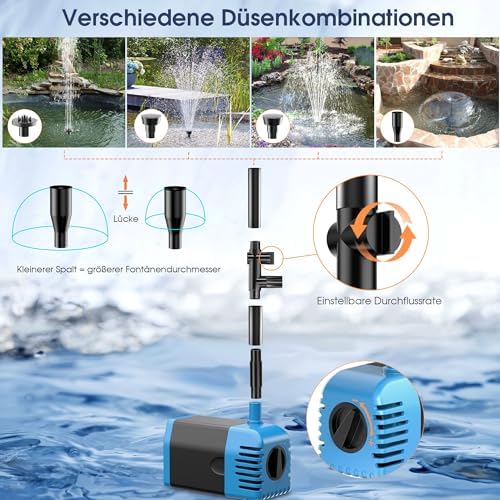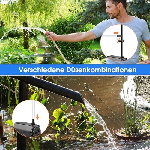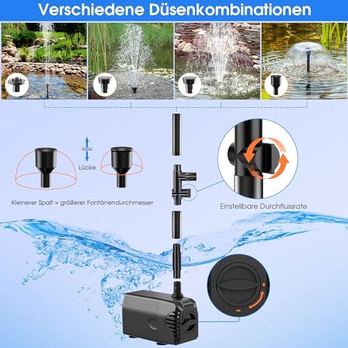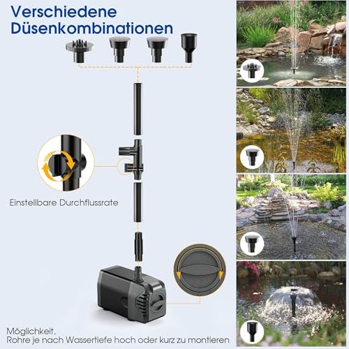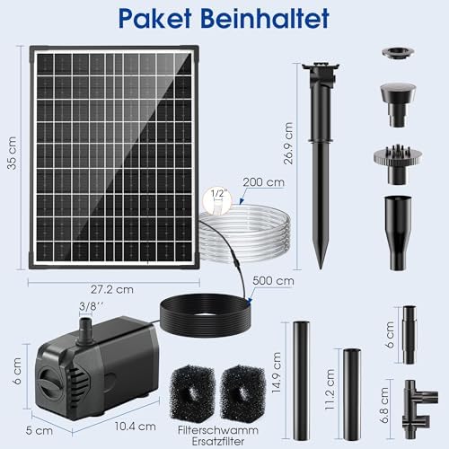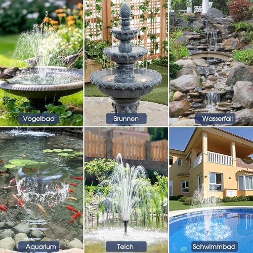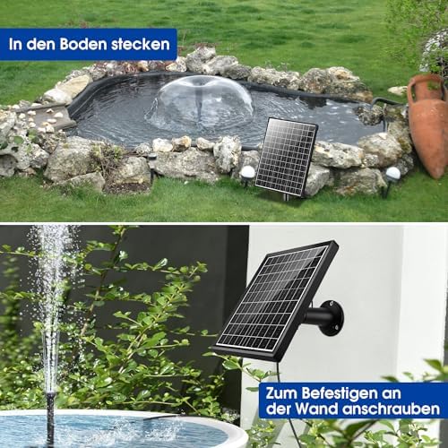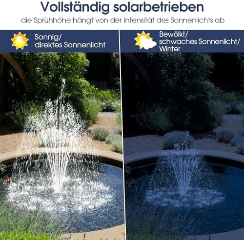 Mit der einstellbaren Wasserflussmenge des Solarbrunnen-Pumpensystems haben Sie die Kontrolle über die Sprühhöhe und die Wassermenge. Der Solar-Gartenbrunnen wird mit vier verschiedenen Düsen und einem Wasserrohr geliefert, sodass Sie Ihre eigene traumhafte Wasserlandschaft schaffen können. Perfekt für einen einzigartigen solarbetriebenen Wasserspielplatz im Garten.