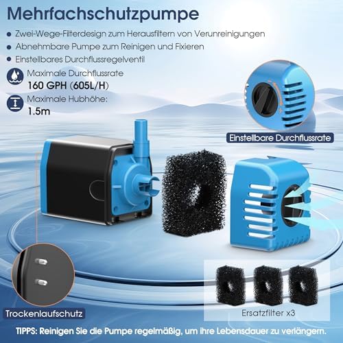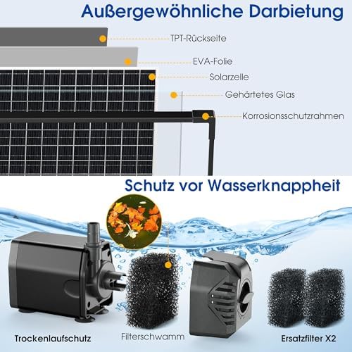 Dieser Solar-Brunnen überzeugt durch eine hochleistungsfähige Teichpumpe, die einen stabilen Betrieb gewährleistet. Dank des integrierten Trocken- und Filterschutzes wird die Lebensdauer der Solarbrunnenpumpe verlängert und der Wartungsaufwand minimiert. Somit können Sie sich auf eine langfristige und verlässliche Nutzung verlassen.