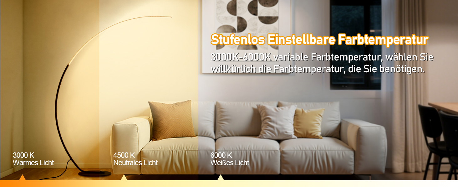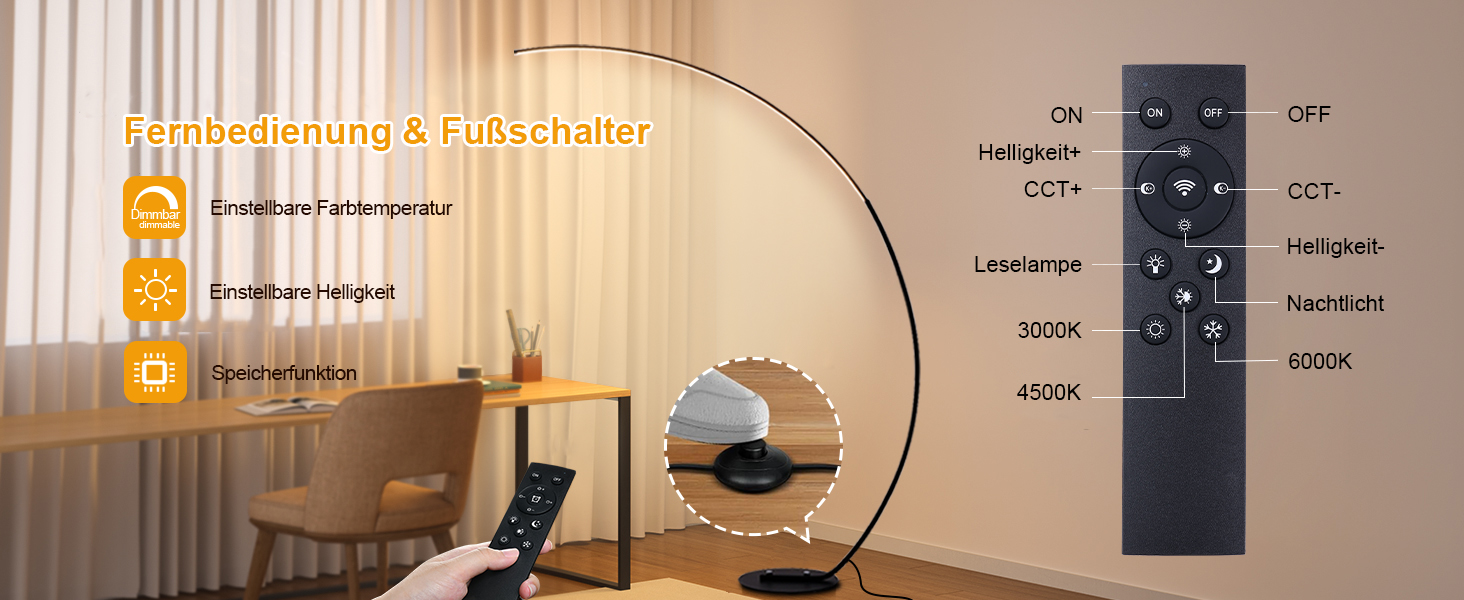 Diese dimmbare Stehlampe wird mit einer praktischen Fernbedienung geliefert, die es Ihnen ermöglicht, sowohl die Farbtemperatur (3000K~6000K) als auch die Helligkeit (5%~100%) ganz nach Ihren Wünschen einzustellen. Egal ob gemütliches Licht beim Lesen oder helles Licht für konzentriertes Arbeiten – diese Lampe passt sich perfekt an Ihre Bedürfnisse und die jeweilige Situation an. Zudem verfügt sie über eine Speicherfunktion, die den letzten verwendeten Lichtmodus speichert.