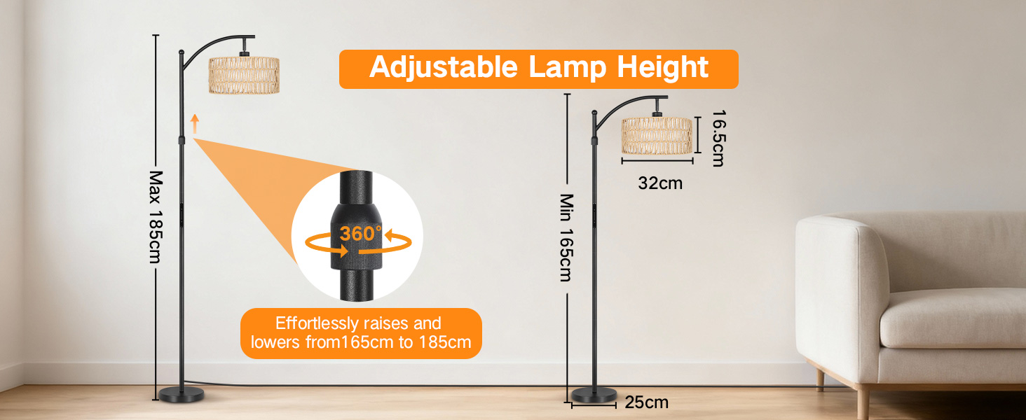 Die Höhe der Stehlampe lässt sich stufenlos zwischen 165 und 185 Zentimetern anpassen. Der Lampenarm kann um 360° gedreht werden, sodass Sie die Richtung des Lichts ganz nach Ihren Bedürfnissen justieren können. Egal, ob Sie beim Lesen helles Licht benötigen oder sanfte Beleuchtung für einen entspannten Abend wünschen, diese Stehlampe passt sich flexibel an.