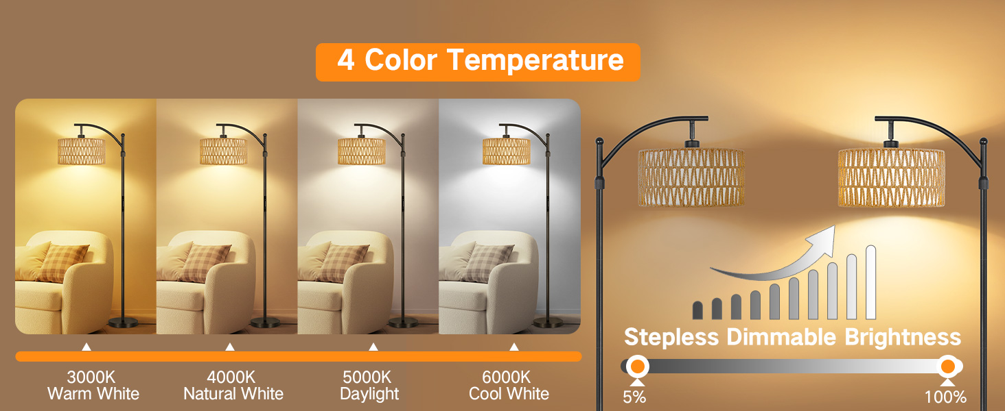 Die dimmbare Stehlampe ist mit einer leistungsstarken 12W LED Glühbirne ausgestattet, die Ihnen von 5 % bis 100 % Helligkeit flexible Lichtverhältnisse bietet. Mit einer Farbtemperatur, die zwischen 3000K und 6000K variiert, können Sie die perfekte Atmosphäre für jede Gelegenheit schaffen. Zudem stehen voreingestellte Modi für unterschiedliche Szenarien wie Lesen im Kinderzimmer, konzentriertes Arbeiten oder entspannendes Nachtlicht zur Verfügung.