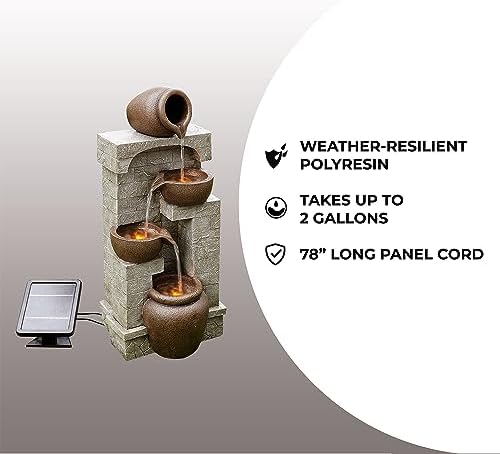 Der Brunnen ist aus robustem Polyresin gefertigt, was nicht nur für ein authentisches Aussehen sorgt, sondern auch Witterungsbeständigkeit, UV-Schutz und Frostbeständigkeit gewährleistet. Dies bedeutet, dass Ihr Gartenbrunnen jede Jahreszeit unbeschadet übersteht und somit eine langfristige Investition in Ihre Gartengestaltung darstellt.