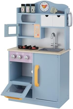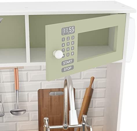 Die Spielzeugküche verfügt über zahlreiche realistische Details, die das Rollenspiel bereichern. Mit zu öffnenden Backofen- und Mikrowellentüren, drei drehbaren und klickbaren Backofenknöpfen sowie zwei Backofenbrennern können kleine Köche ihre Kochkünste praktisch nachahmen. Zusätzliche Funktionen wie zwei Schubladen, eine Spüle und ein Unterschrank bieten jede Menge Stauraum für das Zubehör, während die integrierte Spielzeuguhr den Kleinen spielerisch das Zeitlesen beibringt.